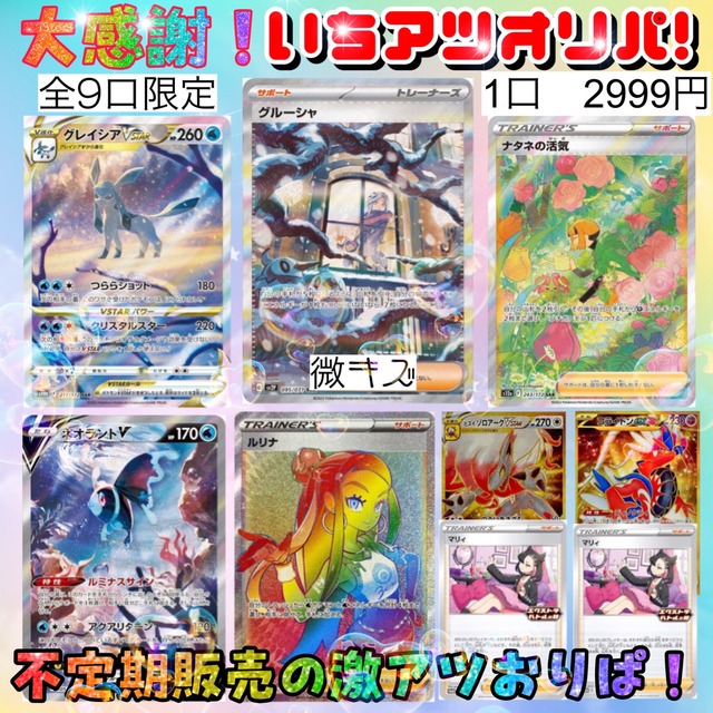 ●ポケモンカードゲーム● ★不定期販売のいちご屋2号店アツアツオリパ★ 『大感謝!!いちアツオリパ!』 いつもいちご屋オリパ2号店をご利用頂き ありがとうございます(´∀`*)⭐︎ 今回は日ごろの感謝の気持ちを込めて 【あど確仕様】のオリパを作成いたしました! 封入内容は画像記載の通り!! トップには激アツのグルーシャSARを封入! その他ラインナップも発売日時点での販売価格(カード◯ッシュ様参考)で上回るように設定しております。 ■内容 ●1口 1枚構成 3199円の予定でしたが大感謝2999円です! ●全9口 ●お一人様 1口まで ●日頃の感謝を込めて送料は無料です! ■発送方法 ご入金確認後、5営業日以内に 追跡可能なヤマト運輸(ネコポス)にて 発送させていただきます! (お客様のお支払い状況によってはお時間を頂く可能性がございます。) ■注意事項 ・カードのレートはカードラッシュ様の店頭販売価格を参考にしております。オリパの中身での低評価等はお辞め下さい。万が一、悪質と判断した場合は今後のご購入をご遠慮頂く場合がございます。 ・封入のカードの状態は基本的に良好ですが、一部初期キズ、微キズありカードがある場合があります。一律【プレイ用】としてお考え下さい。 ・クレジットカード不正利用の疑いがある場合、調査に基づき調査完了まで、発送処理をおこなうことができません、場合によってはキャンセル対応させていただく場合がございます。