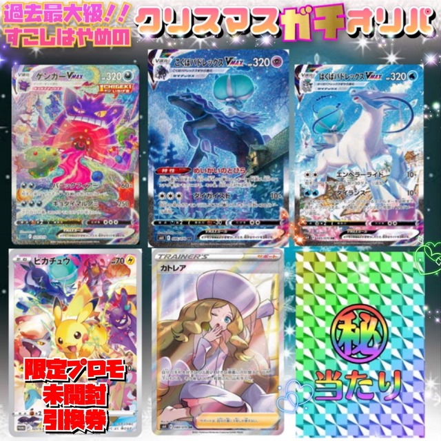 ●ポケモンカードゲーム● 『過去最大級!!すこしはやめの クリスマス"ガチ"オリパ!!』 みなさまいつもありがとうございます( ´∀`)! 今回は少し早めにクリスマスを先取り! 過去最大規模でクリスマスオリパを作成しました! 口数、大当たりラインナップも過去最大級!! かなり!かなり!気合いを込めたラインナップで作成致しましたぁ(*´∀`*)!! 還元重視のアツアツなオリパになっています! 是非チャレンジしてみて下さい! ●1口2900円 / 全100口限定 ●購入制限あり お一人様 20口まで ●5口以上のご購入で送料無料!! ■封入内容 1口2〜3枚構成 カードラッシュ様販売価格580円〜 SR以上(HR.CSR.SSR含む)確定封入 普段なかなか手に入りづらいものから最新弾のカードまで準備しておりますっ!(°▽°) 画像ラインナップ以外にも耐え枠多数封入!! ●発送方法 ご購入後5営業日以内に 追跡可能なヤマト運輸(ネコポス)にて 発送させていただきます! ■注意事項 ・カードのレートはカードラッシュ様の店頭販売価格を参考にしております。またこちらの商品は特性上、当たり・外れがあります。そちらをご理解頂いた上でご購入下さい。 そのためオリパの中身での低評価等はお辞め下さい。万が一、悪質と判断した場合は今後のご購入をご遠慮頂く場合がございます。 ・封入のカードの状態は基本的に良好ですが、一部初期キズ、微キズありカードがある場合があります。一律【プレイ用】としてお考え下さい。 ・クレジットカード不正利用の疑いがある場合、調査に基づき調査完了まで、発送処理をおこなうことができません、場合によってはキャンセル対応させていただく場合がございます。